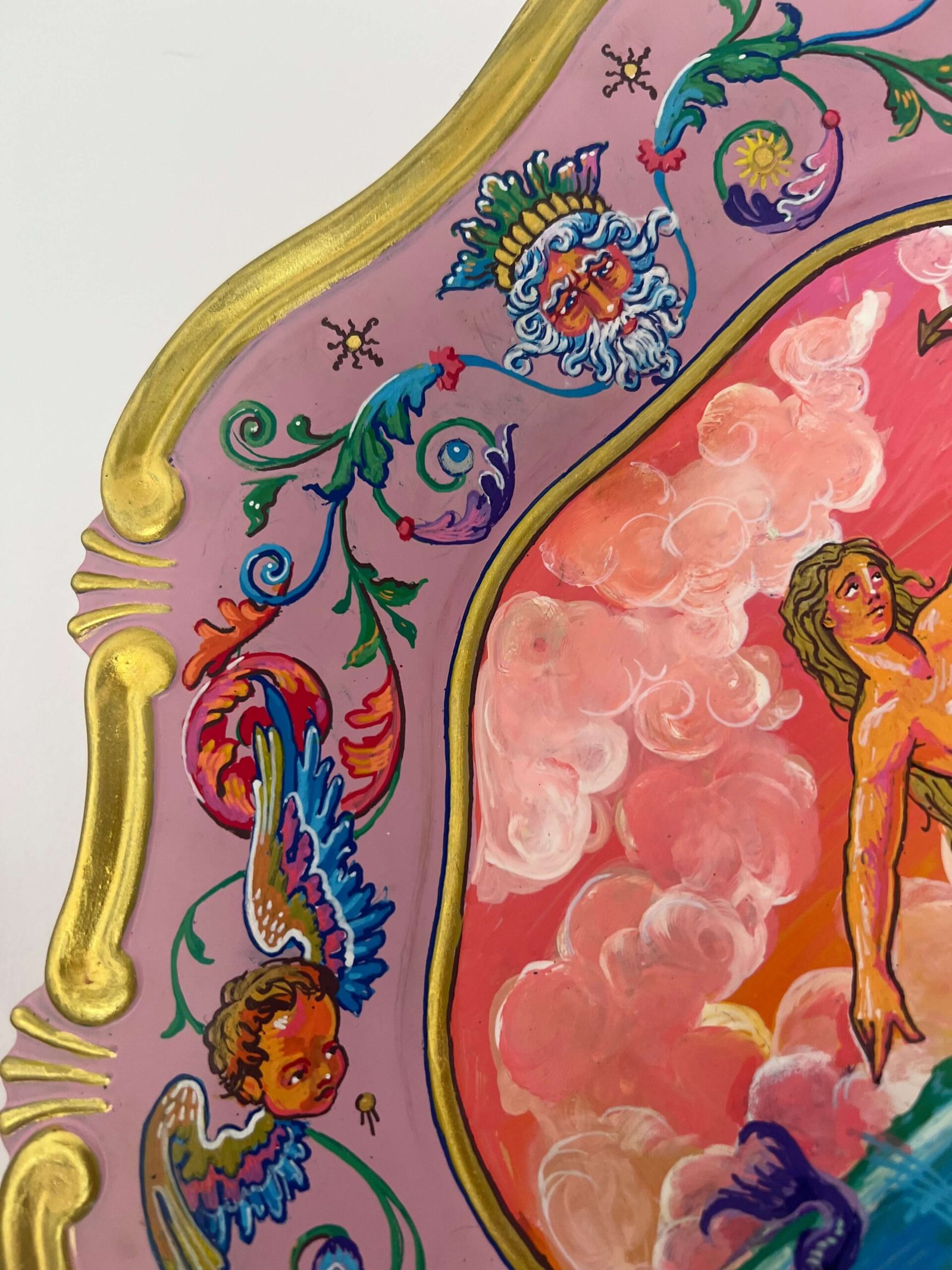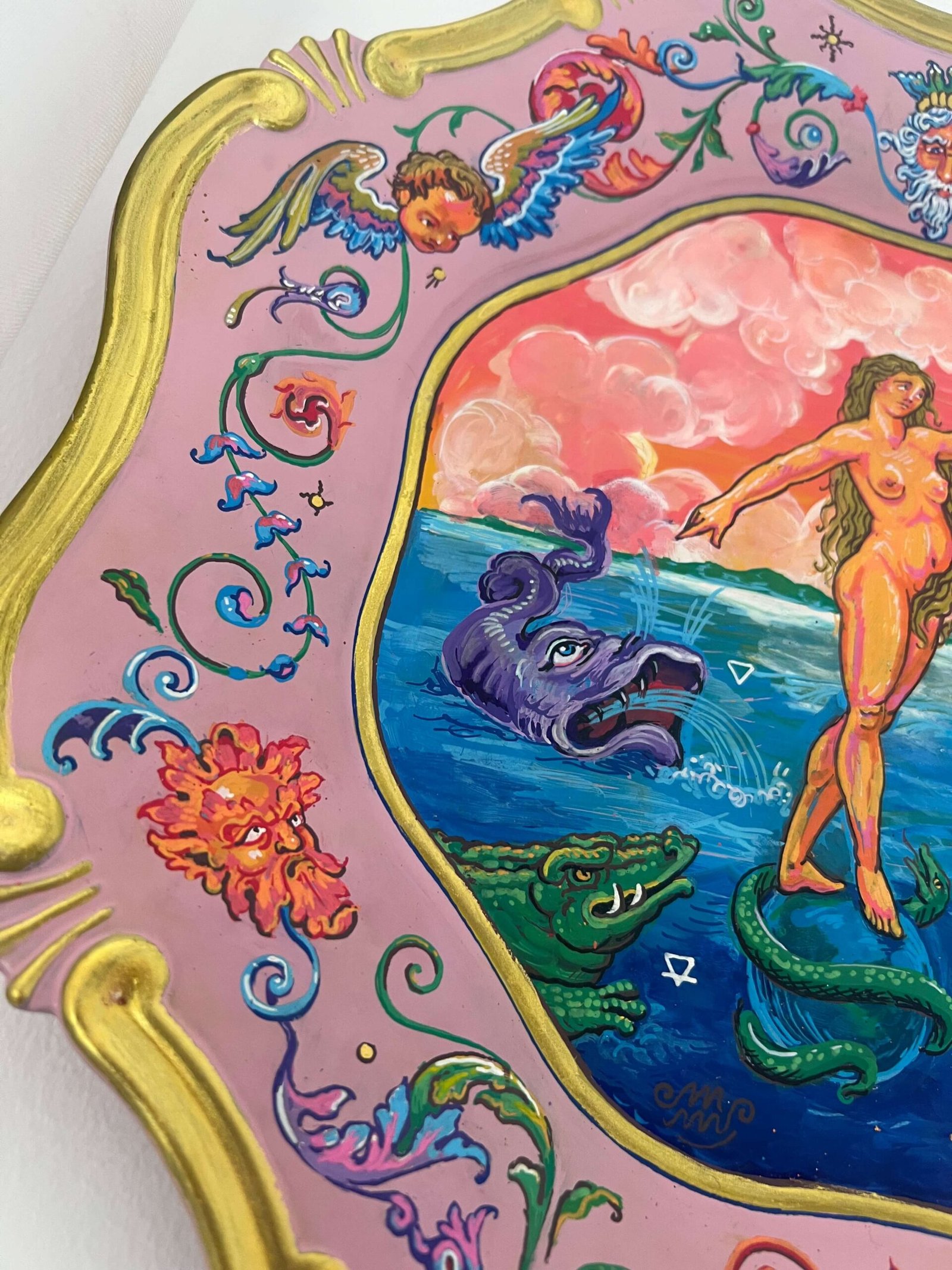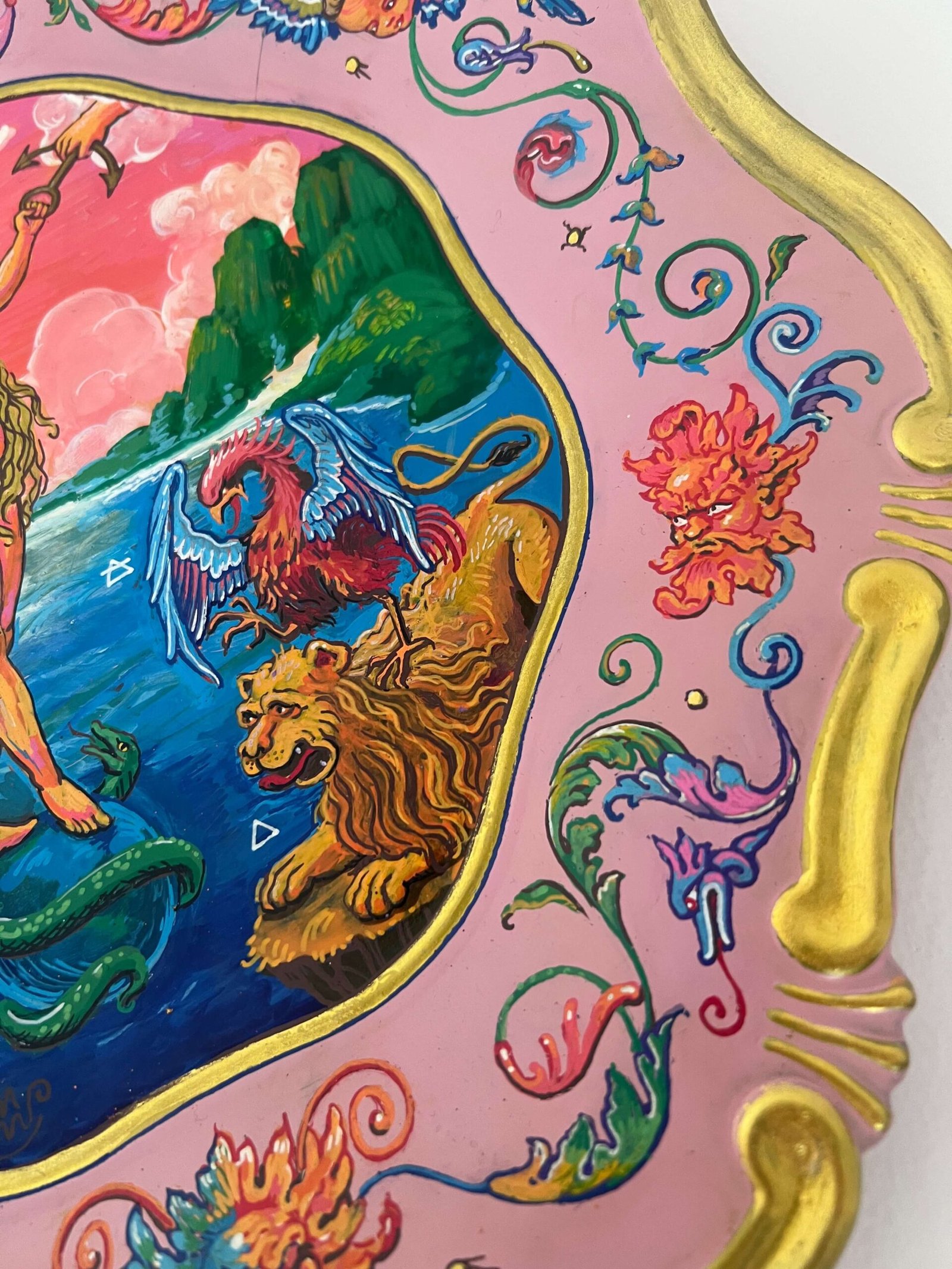 Este cuadro está inspirado en la pintura de Pieter Van Harinxma 1628-1630. Es una imagen alquímica y mi interpretación es la representación del humano como puente entre el cielo y la tierra (lo divino y lo material). En el centro una mujer sujeta un ancla por un extremo y por el otro la mano de Dios. A ella le rodean los 4 elementos aire, fuego, tierra y agua. La mujer se sostiene encima de la bola del mundo que está rodeada por la serpiente (símbolo de la evolución que renace sin cesar de su propia destrucción en un ciclo sin fin). El marco es obra mía y también tiene simbolismo: la parte de arriba es el cielo (vemos la cabeza de Dios representado típicamente como señor de barba blanca y los ángeles serafines guardianes a los lados. En la parte de abajo está su contraparte el Infierno donde Satanás representaría la separación con lo divino en dualidad con los 2 colores y acompañado de sus demonios.