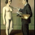 Al comienzo de la espectacular exposición en el Museo Thyssen Bornemisza , la imagen y la palabra casi caligráfica se confabulan con formas biomórficas para despistarnos entre lo que enuncia el texto y lo que la imagen nos presenta. Sin embargo, en su obra de 1928 “Amor: tentativa de lo imposible”(oleo sobre tela ) , el artista -artífice materializa bajo el mito de Pigmalión a su mujer a quien crea para amar, o bien :crea a la mujer con la potestad de un creador pero no de la costilla de Adán sino del pincel de artista mago?